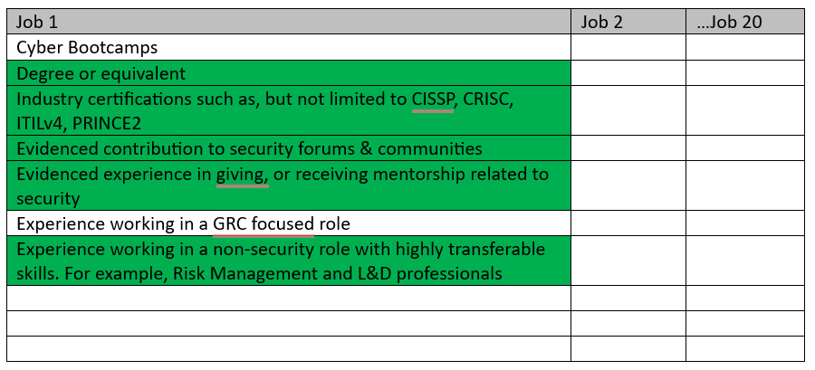 Whenever I conduct a skills audit for GRC Analyst or Information Security Analyst, it’s “creating security policies and procedures” that comes out on top. In my most recent search, 18/20 GRC Analyst advertisements required applicants to develop security policies proficiently.